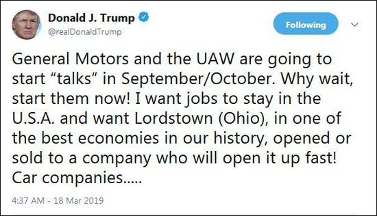 “通用汽车和全美汽车工人联合会将于9月或者10月开始“谈判”。为什么要等呢?现在就开始啊!我希望工作机会留在美国,希望在我们史上最棒的经济形势下,洛兹敦(俄亥俄州),能开出或者出售给一家能马上开门的公司!汽车公司都将回到美国,其他的也是。我们现在拥有世界上最棒的经济,所有人都羡慕我们。现在就让俄亥俄州那座又大又漂亮的工厂开工吧!关闭在中国或墨西哥的工厂,在特朗普当选前,你在那里而不是美国投资很多。把工作机会带回家吧!”
