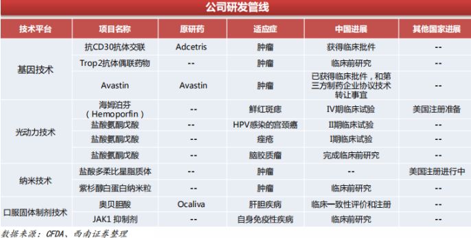 公司在研产品品种丰富,基于基因技术、光动力药物技术、纳米技术和口服固体制剂技术平台的在研新药、生物类似药、仿制药和一致性评价等项目超过11项,覆盖肿瘤、肝胆疾病和自身免疫疾病等多种领域。
