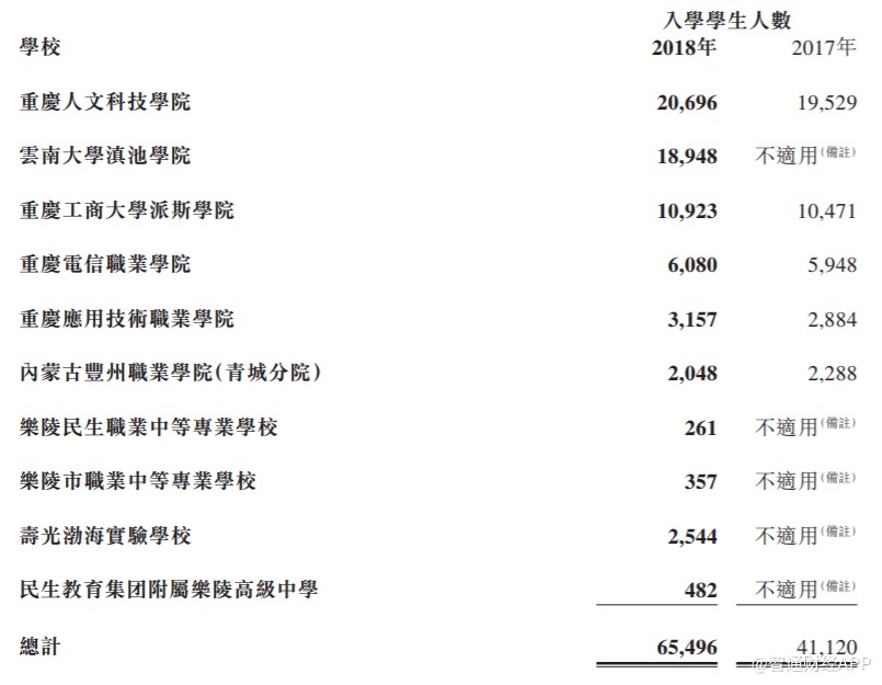 据了解,期内公司完成了3所学校的收购(包括本科、高中及大专各1所);新设立1所中专学校及1所高中,并投资了澳洲成峰教育(01752)。另外,公司还有3所未并表的学校(包括1所大专、1所独立院校、1所本科)。2017年,民生教育旗下仅5所学校,到2018年增加至10所,在校学生人数达到65496名,同比增长59.28%。