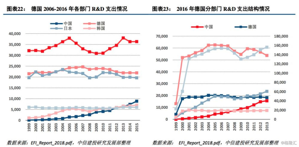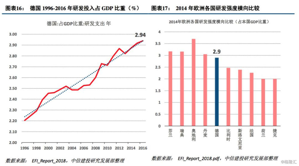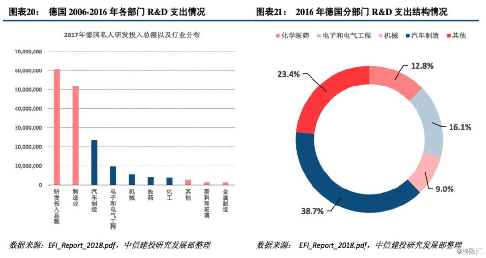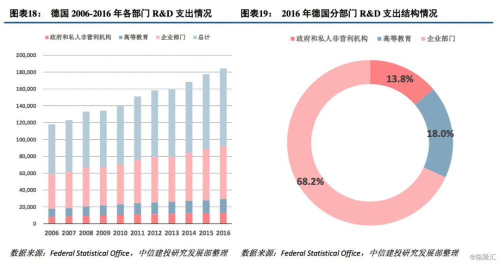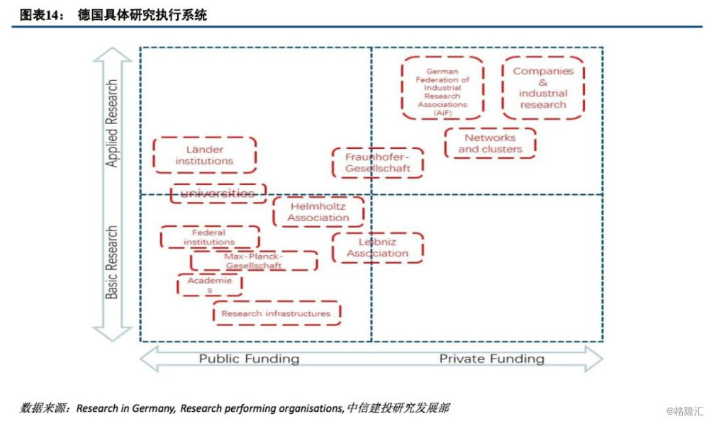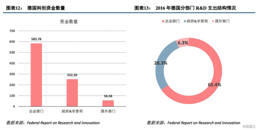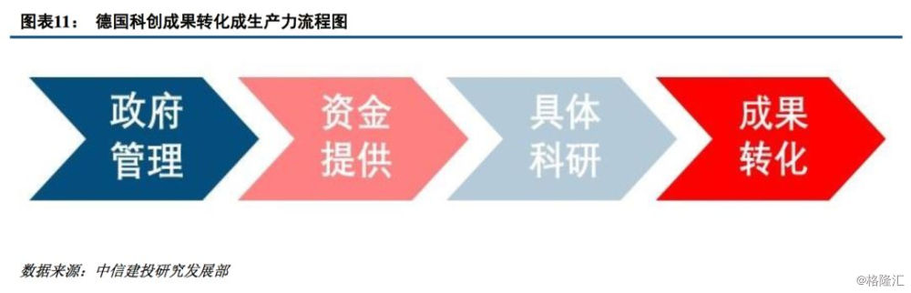 从科创体系来看,科创成果转化成生产力大致需要政府管理、资金提供、具体科研以及研究成果转化四个环节。德国政府的管理和资助,是形成科技创新的原动力。政府管理主要包括科技立法、规划投资、协调咨询三个方面。资金的提供主要来自经济界、政府与私人非营利机构和国外三大部门。具体的科研由高等院校、大学外研究机构和政府研发机构承担。由于良好专利保护,科研成果很好的转化为了生产力。