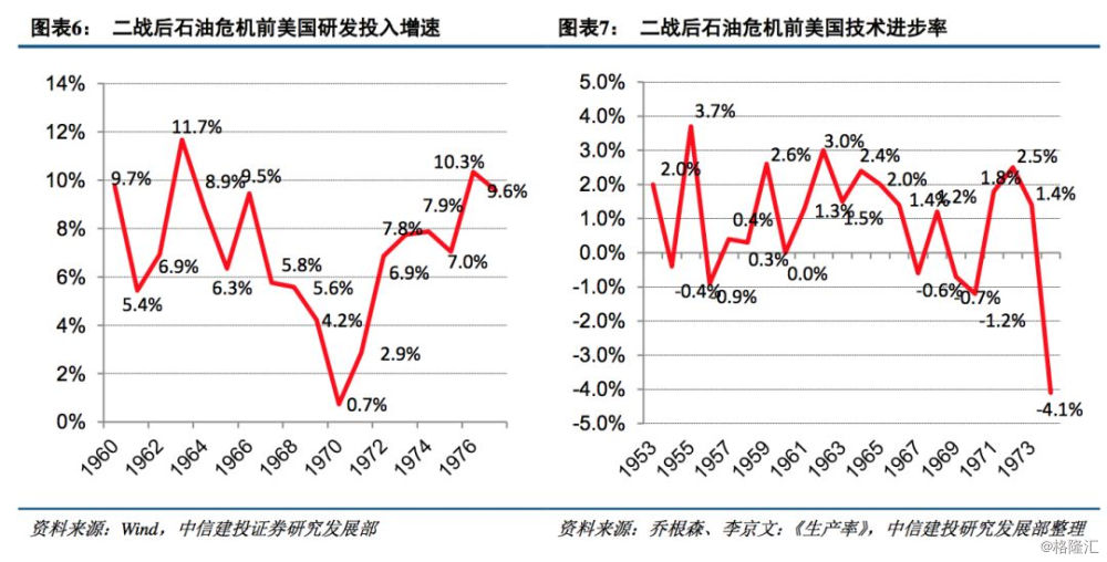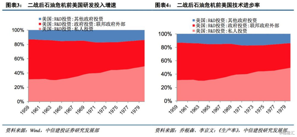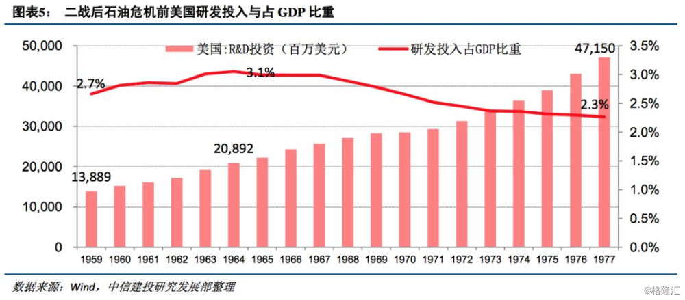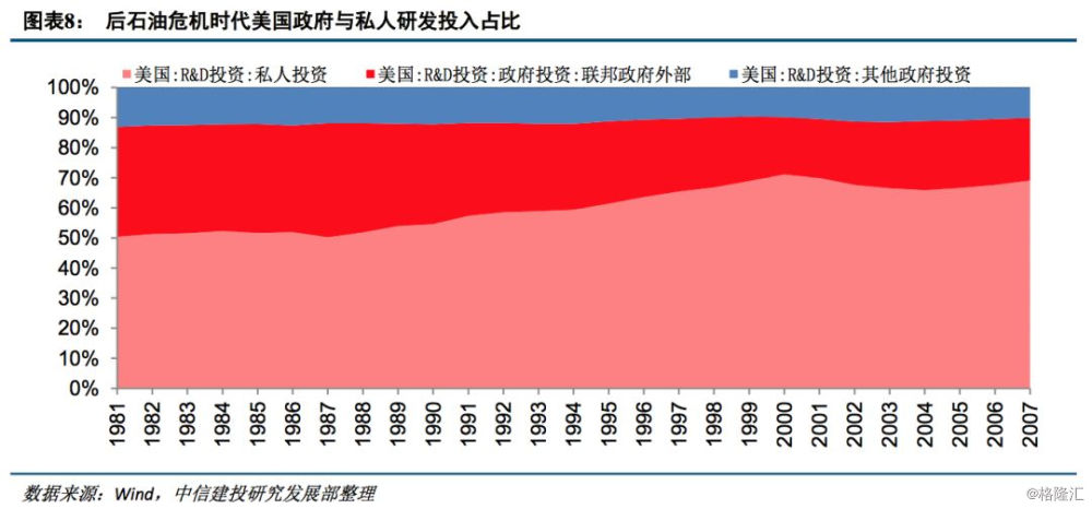 美国主导了第三轮到第五轮的科技革命。二战之后,美国政府机构通过资金、政策等多种方式,对研究体系提供支持,构建了社会研究体系。由于石油危机和日本德国的崛起,民间投资进一步驱动力了科技创新,促进了经济的发展。在计算机、半导体技术和通信技术、军工、医药等每个领域都领先全球,实现了科创立国。