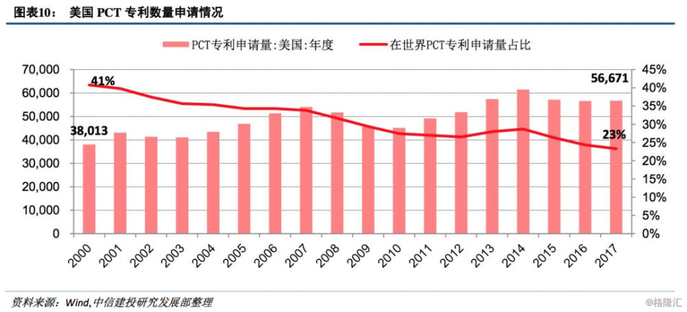 从研发投入看,美国研发占GDP比重常年稳定在2.5%以上。1996年,美国研发投入约2,067亿美元,占当年GDP比重2.55%;2015年,美国研发投入约5,014亿美元,占当年GDP比重2.79%。专利合作协议(Patent Cooperation Treaty)(以下简称PCT)是对于各个成员国提交专利申请进行审查从而满足各国对于专利保护诉求的协议,可以一定程度反映一国的创新能力。在2000年,美国PCT专利申请数量为38,013件,中国则为781件;2018年,美国PCT专利申请数量为56,671件。从专利技术的分布来看,美国的专利申请集中在电气工程、仪器、机械工程和化工等。