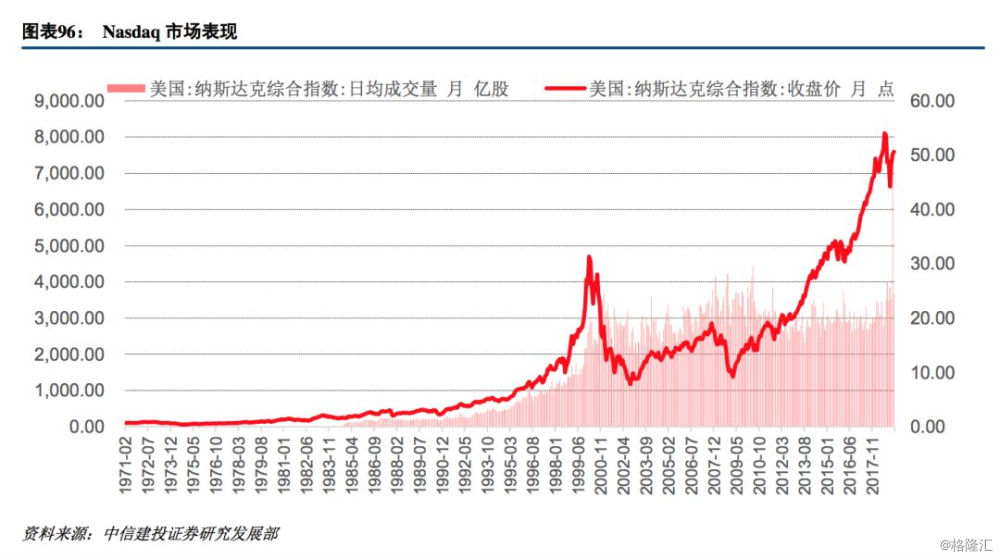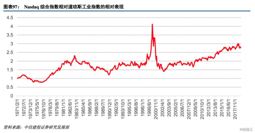 从Nasdaq市场的表现来看,市场推出一年,其综合指数的涨幅就达到24%,而且日均交易量在90年代就已经超过纽约证券交易所。从市值上看,Nasdaq市场的市值占比也在稳步增长,为美国科技行业源源不断提供资金支持,在美国市场中的重要性也快速提升。为了剔除外部的大环境因素,我们制作Nasdaq综合指数相对于道琼斯工业指数的相对占优指数可以发现,指数整体处于上升趋势,在90年代末期,相对指数的累计收益率300%以上。这也从另外一个角度说明了美国科技行业得到了快速的发展。