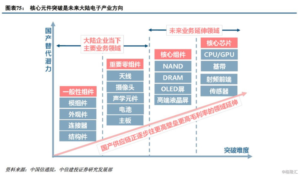 ① 国产化率较低,亟待追赶国外先进水平的核心元器件领域,包括半导体的设计/制造/先进封测,及上游的设备与材料环节;