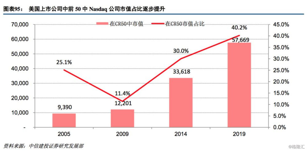 从2005年至今,在美国市值前50的上市公司名单中,Nasdaq培养的上市公司市值稳步从9,390亿美元上升到57,669亿美元,占比从25.1%逐步增加到40.2%。Nasdaq培育的高科技龙头逐渐成为美国经济的支柱,在美国上市公司中的市值占比逐步增强。