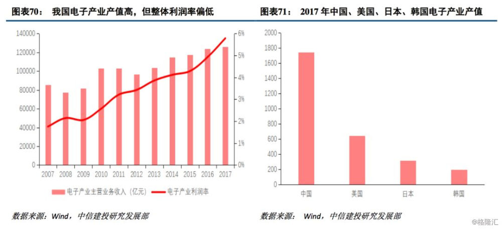 电子行业:中国电子行业产值位居全球第一,现阶段电子产业具备核心技术的部件主要仍靠进口,高额利润被国外厂商夺取,部分核心细分产业如集成电路设计处于国际分工下游,产品附加值偏低,与发达国家相比竞争力偏低。我国电子产业在一些技术核心领域与欧美发达国家相比仍然缺乏竞争力,核心技术领域仍需突破。