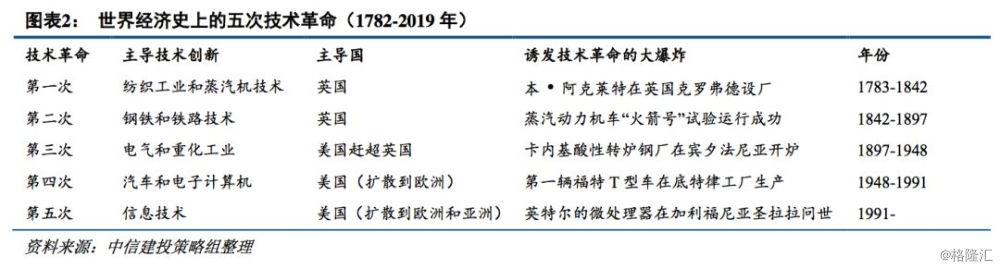 自工业革命以来,世界经济共出现的五次技术革命。第一次技术革命的标志性事件是1771年阿克莱特在英国克罗弗德开设工厂,第二次技术革命标志性事件则是蒸汽动力机车“火箭号”在利物浦到曼彻斯特铁路上试验成功。两次技术革命都发端于英国,随后扩散到欧洲大陆与美国。在第二次技术革命后期,世界经济结构发生根本性变化,美国工业生产总额占比达29%,英国占27%,美国超越英国成为资本主义新的经济中心。随后三次技术革命分别是电力时代、汽车时代与信息时代,主导国从英国转移到美国。