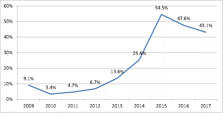 2016-2017年海外收入占比下降主要是因为国内处于周期上行期间,收入增长更为迅速。实际上,2015年,公司海外收入402亿元,2016年为444亿元,2017年为654亿元,逐年提升。