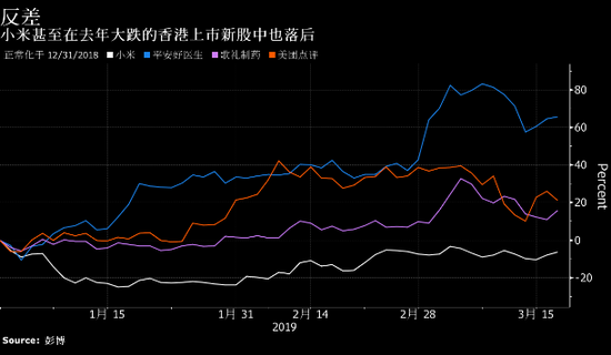 小米是去年香港一批热门新股中战绩惨淡的个股之一 ,平安好医生、歌礼制药和美团点评等公司股价都纷纷下挫。不过,尽管上述后三支股票今年以来至少反弹了10%(平安好医生实际上已反弹68%),小米仍然走势不振。