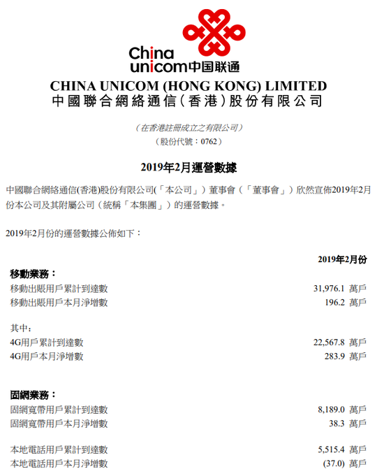新浪港股讯 中国联通发布公告,2019年2月,移动出账用户累计到达数3.20亿户,净增196.2万户;其中,4G用户累计到达数2.26亿户,净增283.9万户。