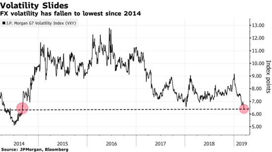 摩根大通衡量全球货币价格波动的指标已降至2014年9月以来的最低水平,因全球最大经济体显示出放缓的迹象,全球央行对其未来货币政策表示谨慎态度。央行官员们一直在观望,今年剩下时间里预计没有央行会加息,每天交易达5.1万亿美元的外汇市场的波动性已经被抑制。