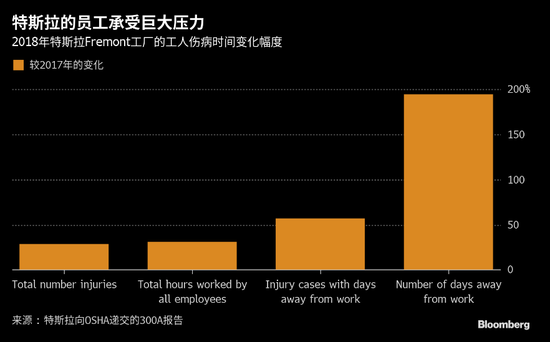 2018年,在特斯拉位于美国加州Fremont的唯一一家组装厂,员工因工作相关的伤病天数达到之前一年的近三倍,在该公司首次大规模生产电动汽车之际,这一数字凸显了员工承受的沉重压力。