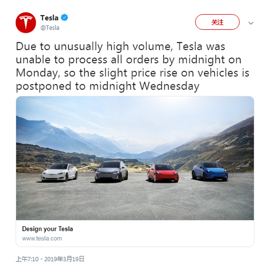 新浪科技讯 北京时间3月19日晚间消息,据彭博社报道,特斯拉在Twitter上宣布,由于成交量异常大,公司无法在周一午夜前处理完所有订单,所以小幅提价将被推迟到周三午夜。