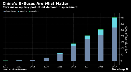 由于大小和持续使用的特征,客车更为重要。彭博新能源财经估计,每1000辆在用电动客车,相当于每天取代500桶柴油需求。相比之下,1000辆电动汽车仅取代15桶石油需求。