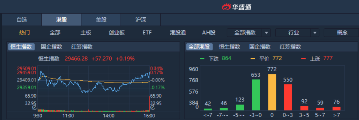 周二恒指早盘低开0.03%,收盘涨57.27点,涨幅0.19%,报29466.28点,全日成交额993.28亿。国企指数涨0.1%,报11686点,红筹指数跌0.3%,报4666.97点。