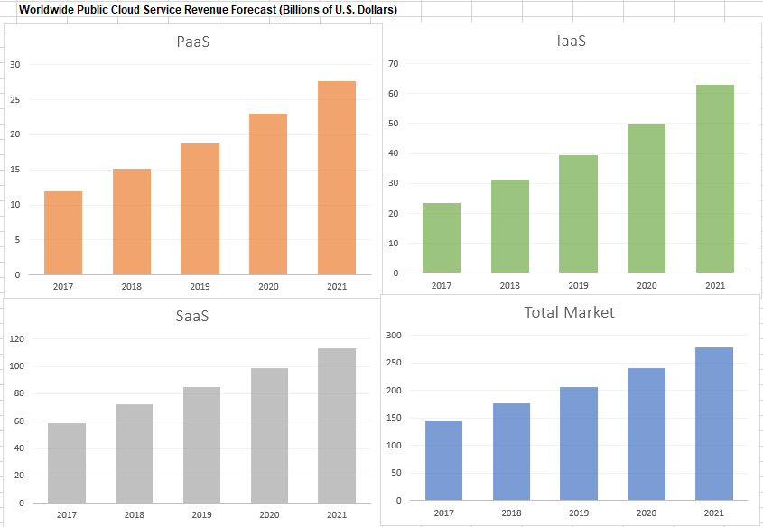 未来几年,整个公共云市场预计将大幅增长,2019年将增长17.3%,其中IaaS是三个市场中增长最快的部分,预计将增长27.6%,总市场价值将达到400亿美元。根据Gartner的预测,SaaS仍然是最大的市场,预计2019年将达到850亿美元的市场价值,如下图所示。