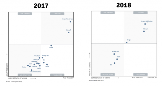 其中,AWS在2017年、2018年市场份额均占据第一,紧随其后的是微软云Azure和谷歌云。