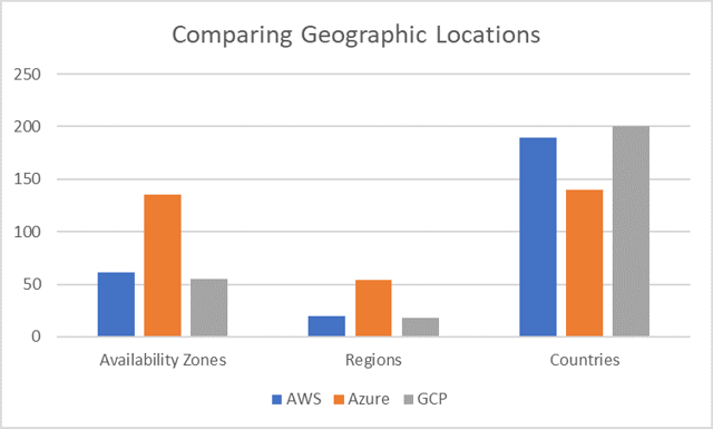 从地理上看,AWS分布在190多个国家,并且还在不断发展。AWS在20个地区拥有61个可用区域,并计划再增加12个可用区域以及再扩大4个地区。而微软的Azure分布在54个地区,每个地区托管2-3个数据中心,估计有135个可用区域。谷歌云平台则分布在18个地区,拥有55个可用区域。
