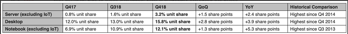 市占率方面,各细分处理器市场份额大幅提升,创历史新高,如服务器处理器(不考虑物联网)市占率从17Q4的0.8%同比大增至18Q4的3.2%,台式机则从12%同比增至15.8%,均创下14年Q4以来的新高。
