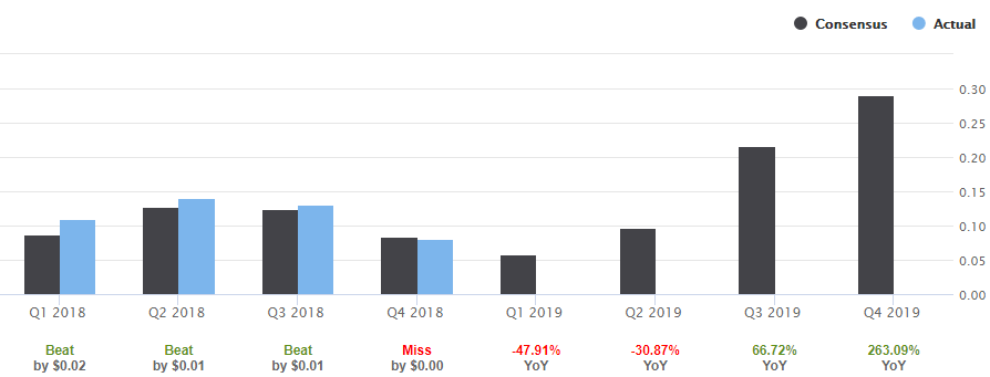 受益于技术、产品及市场策略的快速调整,公司在显卡与处理器市场突飞猛进,市占率提升的同时,业绩也在不断改善,18年前三季度业绩均超预期,年营收同比增23%,为收入连续第二年大幅增长,盈利方面实现同比扭亏,并大幅扩大了毛利率,公布财报后股价盘后交易大涨近10%。根据分析师对未来几个季度的一致预期,预计盈利将在19Q3及Q4大爆发,同比增速将高达66.7%及263%。