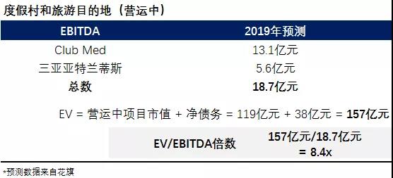 截止3月15日,复星旅文市值约195亿港元水平(大概为165亿人民币),减去上述的资产净值,这意味着剩下营运中的资产估值为119亿元,再加上净债务38亿元,即EV等于157亿元。