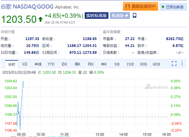 新浪科技讯 北京时间3月20日晚间消息,谷歌开盘报1197.35美元,微跌0.13%。随后,谷歌跌幅扩大,报1196.17美元,跌幅为0.22%。到达最低点后,谷歌估价逐渐上涨至1204.51美元,涨幅为0.47%。而截至北京时间21点47分,谷歌报1203.50美元,涨幅为0.39%。