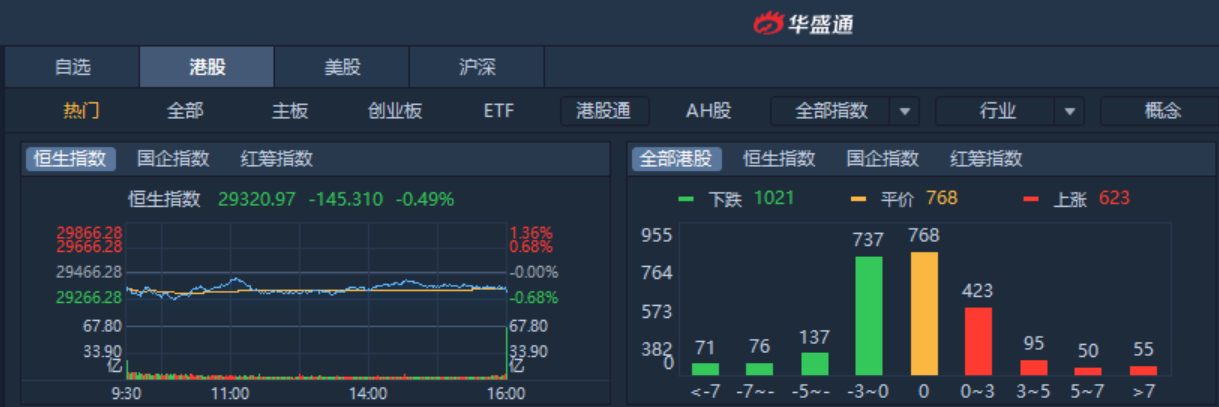 昨日,恒指早盘低开0.37%,全天在低位窄幅震荡,最终收跌145.31点,跌幅0.49%,报29320.97点,全日成交额为1031.69亿。国企指数跌0.53%,报11624.98点,红筹指数跌0.49%,报4644.03点。