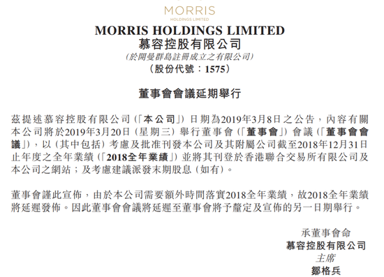 公司表示:由于公司需要额外时间落实2018全年业绩,故2018年全年业绩要延迟发布,董事会会议将延迟至董事会将于确定及宣布的另一日期举行。