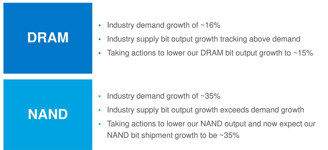 因市场需求减弱,按产品分部,DRAM及NAND收入分别同比下滑9%及2%,占总营收比例为68%及28%,前者销量相对持平,,后者销量有低至中位两位数的增长;均价方面均下滑,DRAM降价高个位数,NAND降价幅度低至中位两位数;