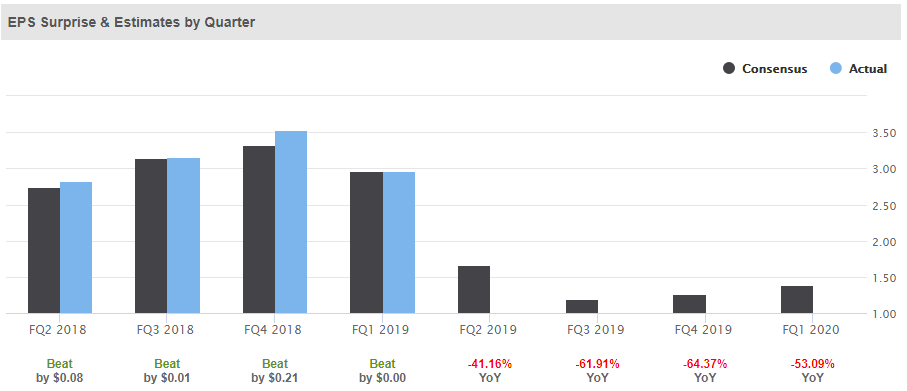 对于之后几个季度,分析师一致预期显示EPS将同比大幅下滑,19Q3至20Q1预计下滑超50%。