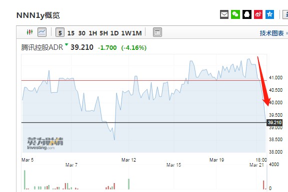 腾讯(00700)盘后公布业绩不及预期,德国法兰克福市场上,腾讯控股ADR短线迅速跳水。截至发稿,报39.21欧元,跌4.16%。股价折合351.46港元,相对于港股收盘价363.00港元跌3.2%。