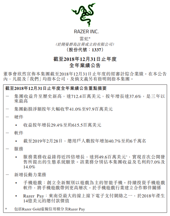 新增长动力业务中,手机游戏创立全新类别以游戏为主的智能手机。持续投资手机游戏软件,将手机游戏带到更高层次,于手机游戏行业建立合作伙伴关系;Razer Pay为东南亚最大的线上线下电子支付网络之一,于2018年产生14亿美元的总付款价值。