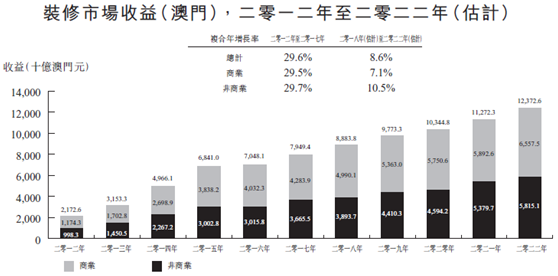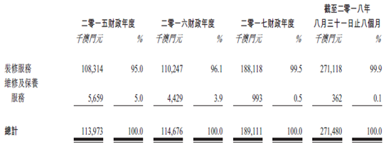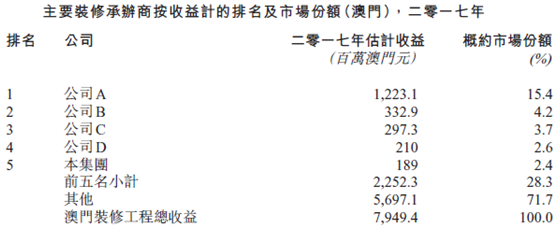 按照收入计算,2017年公司是澳门地区第三大商业装修承建商及第五大装修承建商。
