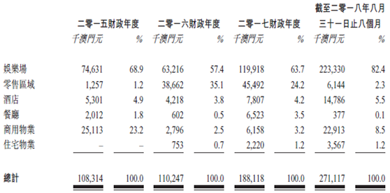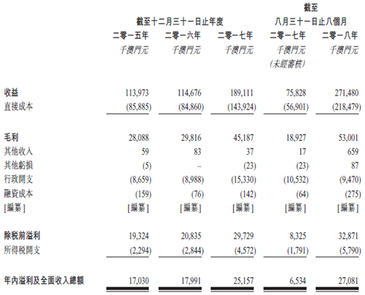 公司2015年、2016年、2017年以及2018年1-8月收益分别为1.14亿澳门元、1.15亿元、1.89亿元及2.71亿元;毛利分别为2808.8万元、2981.6万元、4518.7万元及5300.1万元。