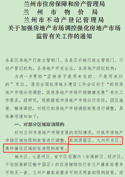 如宣布取消区域限购的兰州,细心的读者不难发现,其不过是取消西固区、九州开发区、高坪偏远区域的住房限购政策,核心城区的限购政策依然未有松动。