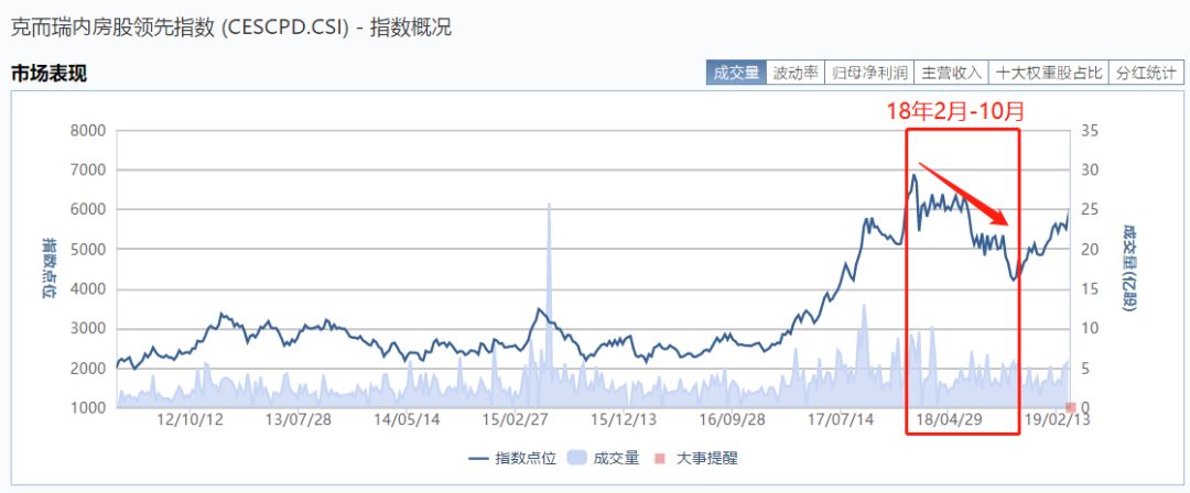 首先,去年是地产行业较为困难的一年,棚改取消、央行“收水”、“五限”政策、贸易摩擦、经济下行、就业压力等,加上多地出现的房屋销售下滑、“金九银十”熄火、“房闹”事件、部分中小房企资金链断裂、龙头房企都大喊“活下去”等等,都为房地产发展蒙上一层阴影,市场预期悲观,从而拖累内房股股价下跌,从克尔瑞指数不难看出,18年2月至10月,指数一直处于下跌区间,跌幅接近40%,市场出现一定的恐慌。