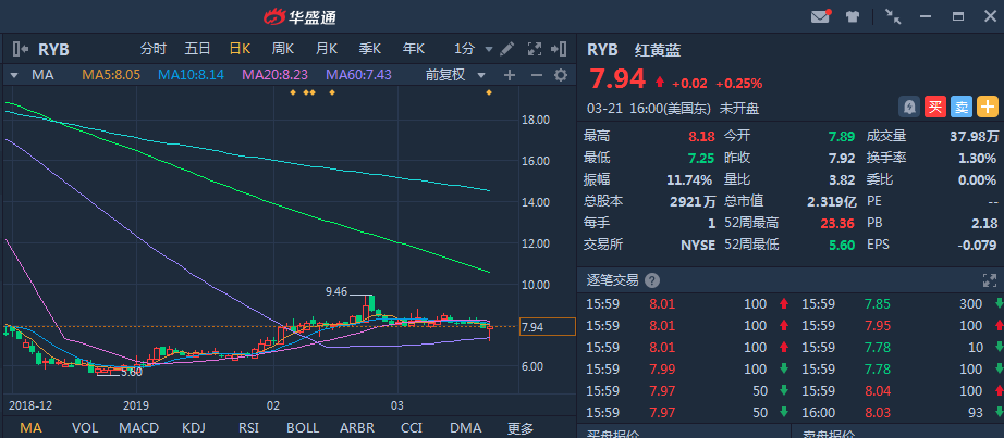 此财报一出,红黄蓝股价昨日收跌2.94%报7.92美元,截止今日发稿,其股价微涨0.25%,暂报7.94美元,最新市值为2.276亿美元。