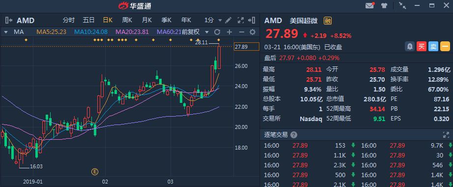 近日对AMD影响比较大的消息是AMD将为谷歌新发布的云游戏平台Stadia提供服务器硬件和定制的GPU。分析师认为Stadia有望颠覆视频游戏行业,也将给AMD带来巨大利好,ADM股价也迎来大涨。这在半导体行情还不明朗的2019年对AMD的营收和利润将会产生比较大的利好。