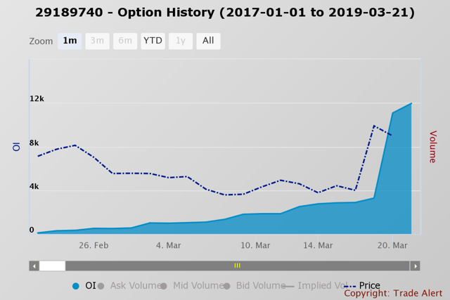 将于5月17日以26美元执行价到期的期权,近几天大幅增加,达到12000份左右,如下图所示。由于看涨期权的交易价格约为每份2.70美元,那么,公司股价需要涨至28.70美元,才能使得期权投资者获利,这一价格要相比3月15日的价格上涨8.25%。这同样反映了期权投资者对公司股价的看涨态度。