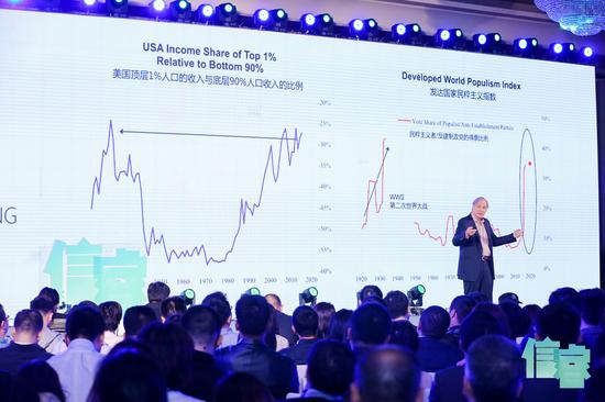 与此相关,我们可以看到另外一个重要的因素,那就是财富缺口的增加和财富差距的增加,收入的差距,从20世纪30年代开始到现在,收入的差距是最大的,这是人们之间收入的差距和财富的差距。现在我们可以看到1%的人口,他们的财富是下层的90%人口财富的总和,因为金融资产价格的上升使得富人变得更富,只有富人才有金融资产。另外还有其他的要素,比如说技术。技术也使得财富差距变大,因为技术使得低技能的工人失业,所以我们的财富差距越来越大。这个财富差距在拓宽,我们看到民粹主义抬头,这是政治在发挥作用了,民粹主义开始在西方非常盛行。左翼和右翼都会有民粹主义,左翼的民粹主义,他们没有太多钱;右翼民粹主义资本家也会有一定的良知,这里我们衡量的是民粹主义的抬头。也就是面临社会问题了。
