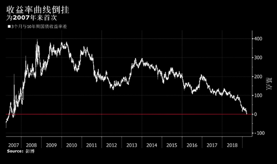 新浪美股讯 在本周美联储政策决议释放鸽派论调后,周五,美债收益率曲线上广受关注的一段自2007年以来首次倒挂。伴随全球债市上涨,3个月期与10年期美债收益率差跌破零。收益率曲线倒挂是可靠的经济衰退指标。