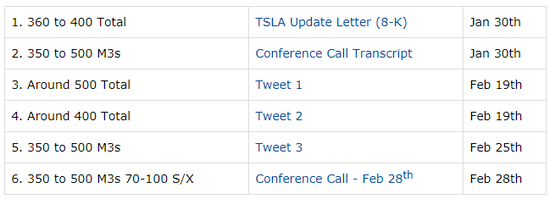 最后,在2月28日的电话会议上再次提出指导意见。“……我在财报电话会议上说的是35万至50万辆Model 3, 7-10万辆的Model S和Model X“这是收益电话的第二次重复,以60万辆车作为上限。