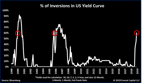 科斯塔说,投资者不应专注于任何一种反转,Crescat关注的是美国收益率息差中倒置的总比例。在下面的图表中,这一比例从2018年初的0左右跃升至本周的60%。