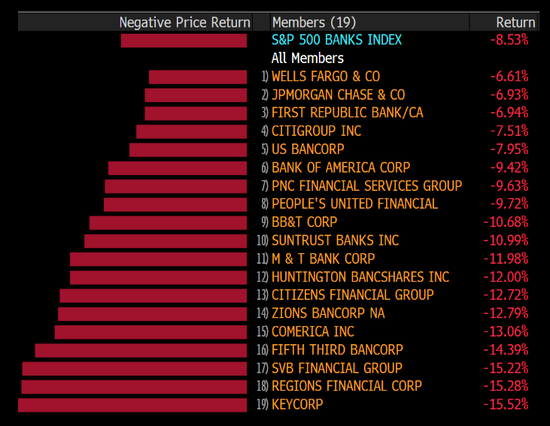 但情况到底有多糟糕呢?自周一以来,拥有19个成员的标准普尔500银行股指数(S&P 500 Banking Index)中没有一只股票在日常交易中上涨。