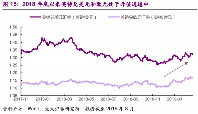 但是进入2季度,英镑能否持续处于升值的通道面临不确定性。2019年3月中旬,英国议会投票否决了英国首相此前与欧盟达成的脱欧协议,否决了无协议脱欧提议,但通过了延期脱欧的动议。英国议会的投票基本宣告了英国不会在原定的3月29日如期脱欧。延迟脱欧,势必将强化英国市场的不确定性,而北爱尔兰边界的条款涉及的政治问题错综复杂,预计很难在6月之前得到妥善的解决,硬脱欧甚至重新公投的概率都开始上升。