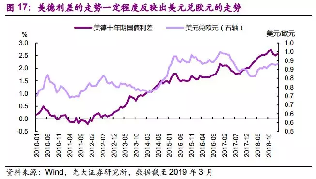 虽然2019年美国减税的刺激效果减弱,其经济增速较2018年下滑,但美国的房地产市场、股票市场以及劳动力市场仍然相对稳健,美国在2019年陷入衰退的可能性并不大。反观欧洲2019年1-2月经济数据好于预期,但是欧洲的政治纷扰以及脱欧事件的悬而未决,使得欧洲市场不确定性因素依然较多,避险情绪推低了德国的国债收益率。美国和德国10年期国债利差短期仍有继续扩大的可能,欧元对美元汇率有可能仍将处于小幅贬值的通道中(图17)。