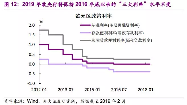 根据欧央行的利率前瞻指引,预计欧央行2019年,将继续保持2016年以来的三大利率保持不变。目前欧央行的三大利率分别为:主要再融资利率(Main Financing Operations),利率水平为0%;隔夜贷款利率(Marginal Lending Facility),利率水平为0.25%;隔夜存款利率(DepositFacility)利率水平为-0.4%(图12)。