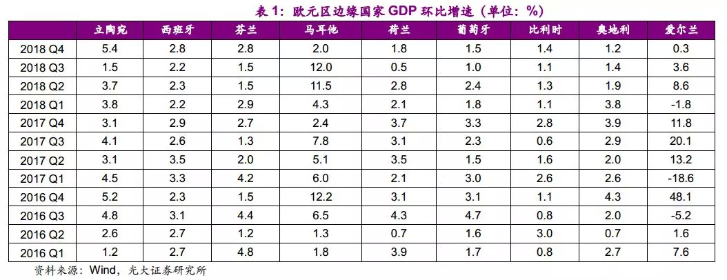 而欧洲非核心国家比如立陶宛、西班牙、芬兰2018年第4季度的GDP环比增速均大于2%,其中立陶宛的增速最大为5.4%(表1)。