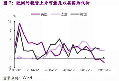 欧元区投资2018年出现回暖迹象,而英国投资却持续下行。欧元区固定资本形成总额增速自2015年以来持续下行,但自2018开始有形成了上行的态势,截至2018年3季度处于3.5%左右的位置(图6)。欧元区固定资本形成增速上行的同时,伴随着的却是英国投资的下滑。自脱欧公投后,由于市场表现强于预期,英国投资增速曾一度上行。但随着英国脱欧日期临近,越来越多的投资者开始将目光从英国转向欧元区,英国投资增速在2018年出现大幅下滑,从2017年4季度的3.9%一路下滑到2018年4季度的-1.4%(图7)。
