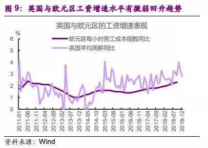 劳动力工资持续缓慢上行。欧元区每小时劳动力成本指数长期保持着正增长。2014年第一季度其同比增速落至历史低点1.1%之后开始触底反弹,2018年第三季度增速已上行至2.3%。英国平均周薪同比增速自2014年4月出现-1.4%的增速之后一直保持着正增长,近两年的增速水平维持在3%左右(图9)。